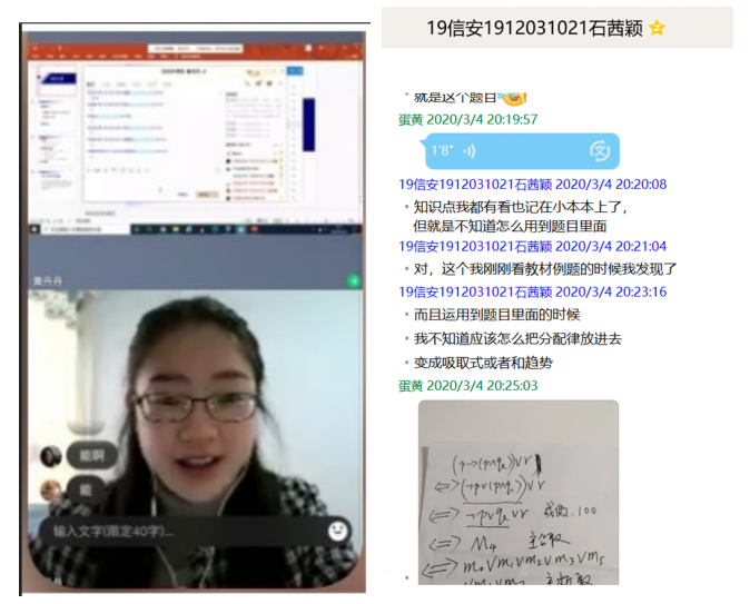 黃丹丹老師通過“慕課+直播”授課的模式完成教學(xué),課前學(xué)生先簽到、在中國大學(xué)MOOC自學(xué),然后再利用以教師為主導(dǎo)的QQ視頻直播,講解具體案例,引導(dǎo)學(xué)生互動學(xué)習(xí),啟發(fā)式的教學(xué)可以讓學(xué)生積極主動地進(jìn)行探究式學(xué)習(xí)。鼓勵學(xué)生在線提問,在線討論,并充分發(fā)揮網(wǎng)絡(luò)的便捷性,實時給出解答,保證學(xué)生良好的學(xué)習(xí)效果。在直播時布置小練習(xí),并要求學(xué)生當(dāng)堂完成,然后以截圖共享的形式檢查練習(xí)結(jié)果,保證學(xué)生既能認(rèn)真聽課,又能真正理解。