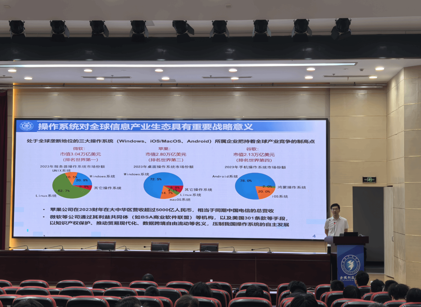 古金宇副教授圍繞操作系統(tǒng)的重要性、學(xué)習(xí)操作系統(tǒng)的優(yōu)勢(shì)、新的操作系統(tǒng)落地實(shí)踐、操作系統(tǒng)科研四個(gè)方面,為同學(xué)們帶來(lái)了一場(chǎng)精彩紛呈的報(bào)告。他深入剖析了操作系統(tǒng)在全球信息產(chǎn)業(yè)生態(tài)中的核心地位,以及國(guó)產(chǎn)操作系統(tǒng)如鴻蒙在突破技術(shù)瓶頸、實(shí)現(xiàn)自主可控發(fā)展方面的卓越成就與廣泛應(yīng)用前景,為同學(xué)們點(diǎn)亮了探索操作系統(tǒng)奧秘的明燈。