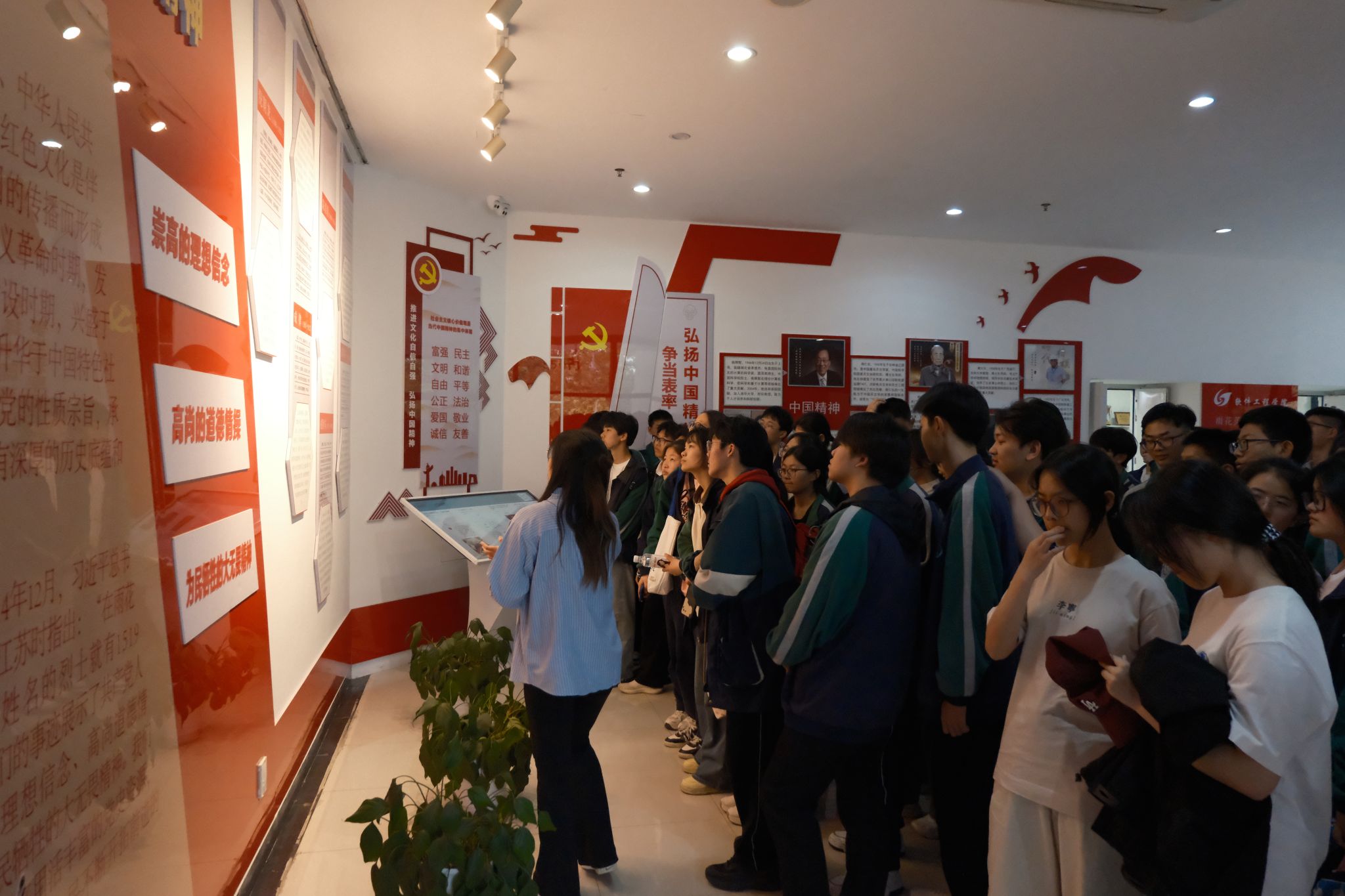 活動(dòng)伊始,志愿者們以飽滿的熱情和專業(yè)的素養(yǎng),帶領(lǐng)建湖第二中學(xué)的學(xué)生依次參觀了校動(dòng)漫圖書館和軟件工程學(xué)院雨花英烈精神展廳。在雨花英烈精神展廳,講解員圍繞學(xué)院思政工作的文化、時(shí)代和專業(yè)特色凝練方面的重要舉措,結(jié)合南京本土紅色文化的歷史資料和學(xué)院全面開展鮮活實(shí)踐案例做了宣講。學(xué)生們神情肅穆,認(rèn)真聆聽,在歷史與現(xiàn)實(shí)的交匯中感受著紅色文化的力量,汲取著寶貴的精神養(yǎng)分。