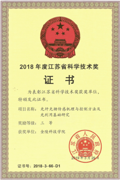 胡興柳、楊忠,光纖光柵傳感機(jī)理與控制方法及光利用基礎(chǔ)研究,江蘇省科學(xué)技術(shù)獎(jiǎng), 三等獎(jiǎng),2018 年